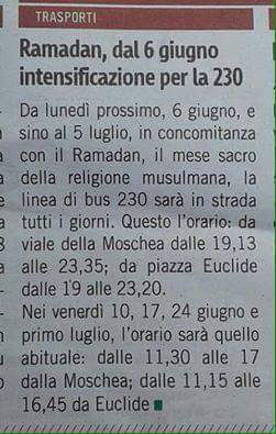 بمناسية شهر رمضان الكريم، قررت ادارة الوكالة الحضرية للنقل العمومي “ATAC” بالعاصمة بروما تعزيز خط النقل الحضري الذي يربط مسجد روما الكبير بباقي أنحاء المدينة بحافلات إضافية لتسهيل تنقل المسلمين في ايام رمضان لاداء التراويح.